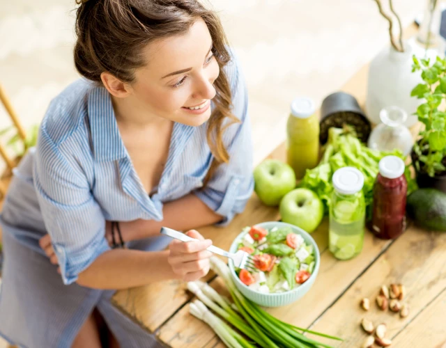 Jedz zdrowo. Dużo warzyw i owoców, potraw bogatych w białko, białego mięsa i ryb. Zrezygnuj z pustych kalorii. Unikaj słodkich i słonych przekąsek oraz przetworzonej żywności.